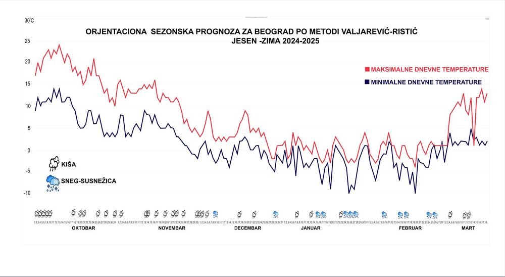 "Prema našoj orjentacionoj dugoročnoj prognozi, prve snežne padavine će biti u drugoj polovini novembra, najverovatnije krajem tog meseca pogotovo južnije od Beograda, ali i u Beogradu. U decembru će biti dve – tri snežne epizode, dok će najviše snega biti u januaru i februaru. Karakteristika ove zime je da će dominirati Azorski i Sibirski antickloni, ali i Mediteranski ciklon. On donosi to da kada dođe hladan vazduh iznad nas bude dosta snega. Dakle, hladan vazduh sa severa i severoistoka Evrope i vlažni mediteranski vazduh obrazuju polarni front sa snegom. Polarni, ponekad i artički front, će povremeno talasati iznad Srbije", navodi za Espreso Ivan Ristić.