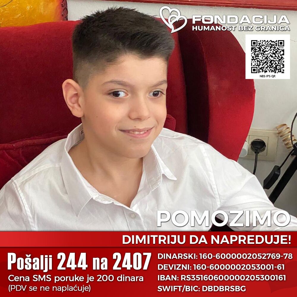 Ovim putem molimo sve ljude dobre volje da pomognu Dimitriju za njegov napredak, tako što će preko FONDACIJE – humanost bez granica poslati SMS sa brojem 244 na 2407. Uplate za pomoć u lečenju mogu da se izvrše i na dinarski i devizni račun korisnika i putem E-doniraj internet plaćanjem platnim karticama iz celog sveta, kao i preko platforme PayPal.