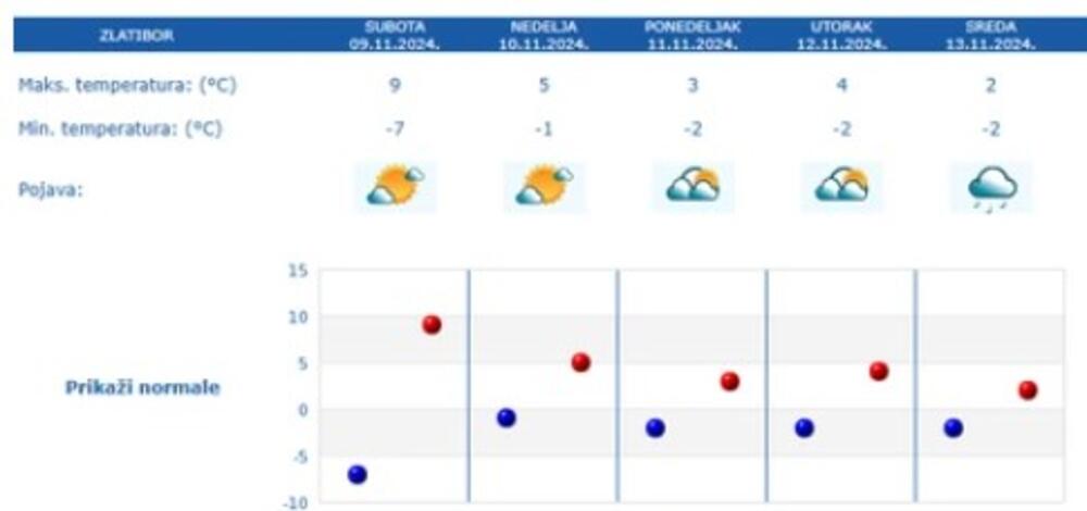Prema prognozi, jutarnje temperature biće u minusu u Novom Sadu, Nišu, Kragujevcu, kao i na Zlatiboru, gde će već sutra ujutru biti debeo minus, tačnije - 7 stepeni. Temperature nešto iznad nule biće u Beogradu, Loznici i Paliću.