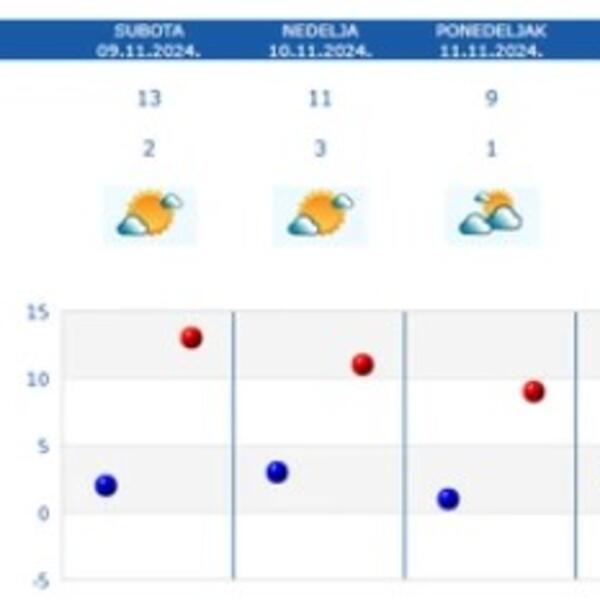 - Dnevna temperatura od nedelјe je u manjem padu u odnosu na prethodni period i u većini mesta kretaće se od 8 do 12 stepeni Celzijusovih. U nedelјu će pretežno sunčano - najavljuju iz Republičkog hidrometeorološkog zavoda. Od početka sledeće nedelje doći će do postepenog povećavanja oblačnosti, a u ponedeljak se očekuje i pojava kiše u pojedinim delovima zemlje.