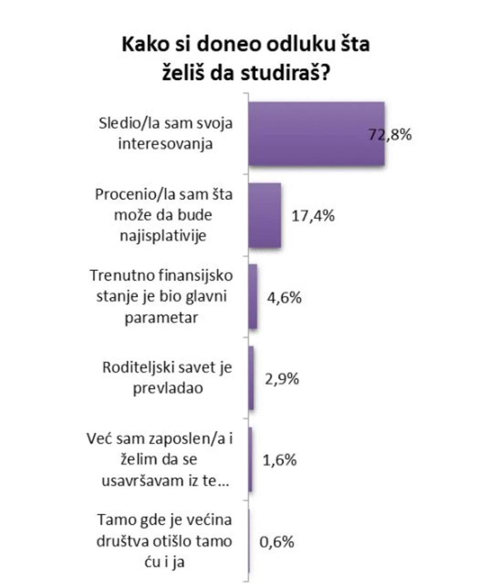 Većina anketiranih budućih studenata samostalno je donosila odluke o studiranju, bez roditeljskog uticaja. Isključivo na osnovu ličnih interesovanja, ili u skladu sa najisplatljivijim zanimanjima.
