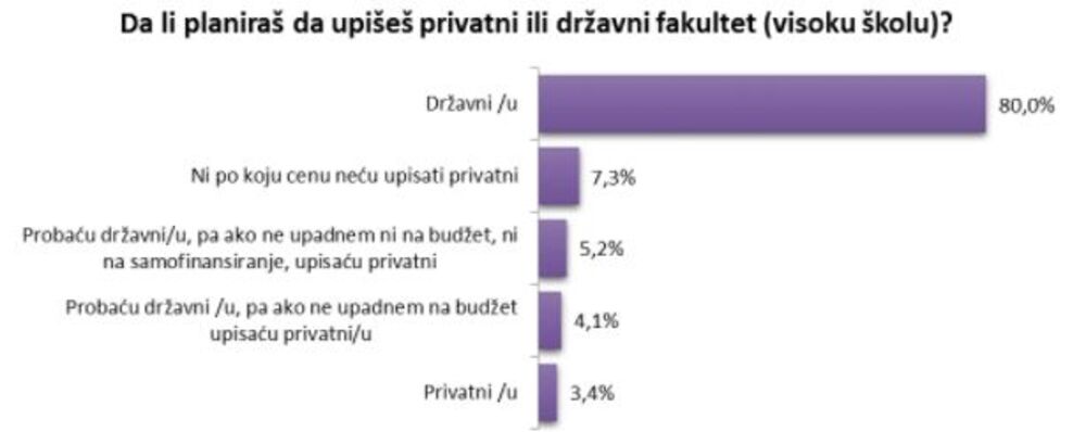 Neznatan broj ispitanika izjasnio se da ni po koju cenu neće upisivati privatne fakultete, dok je približno 13 odsto njih potencijalno zainteresovano za školovanje u privatnim ustanovama, a svega 5 odsto ispitanih privatni fakultet vidi kao krajnju opciju, samo ukoliko ne uspeju da upišu željeni državni fakultet.