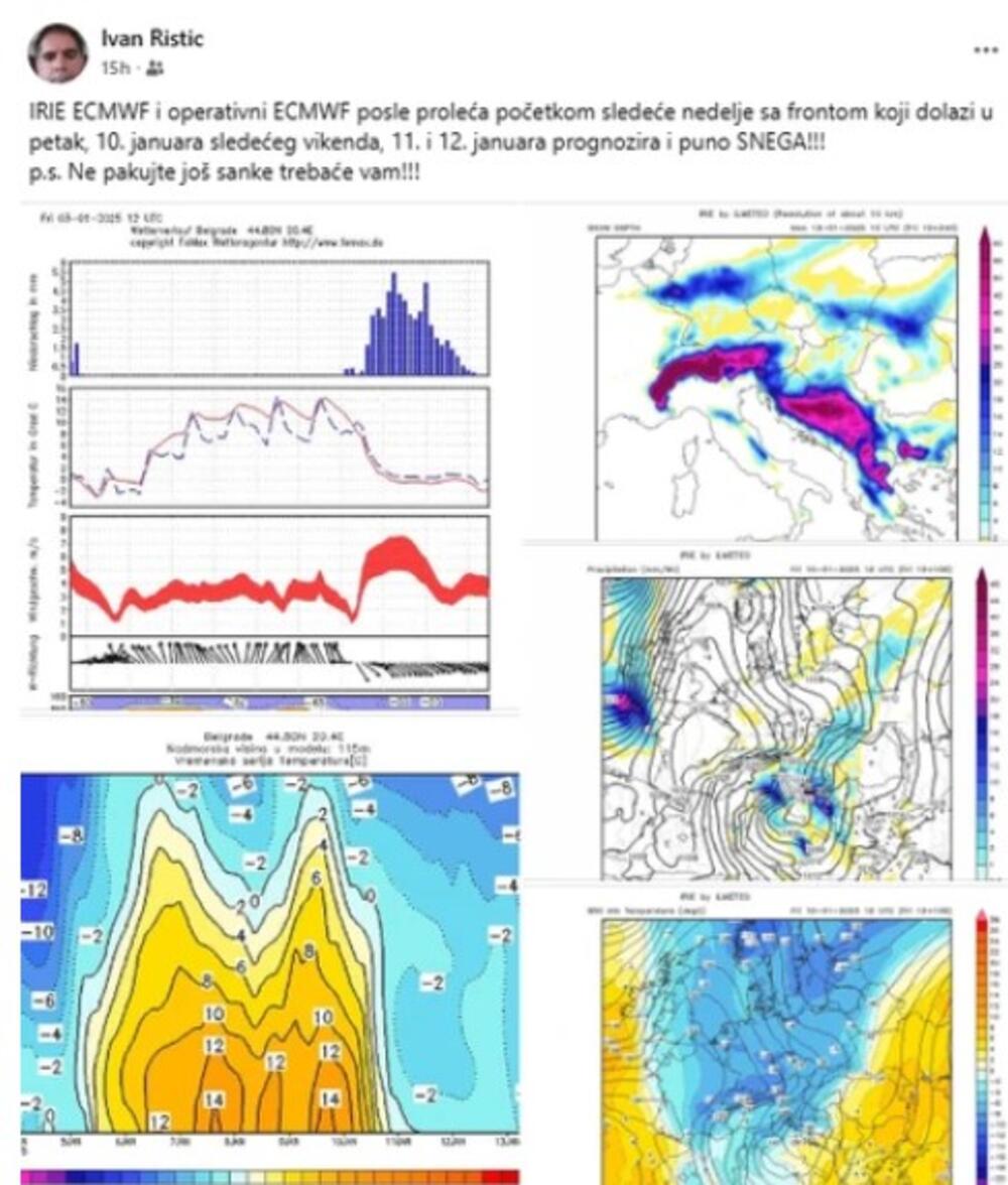 MJO indeks pravi zaokret narednih dana i posle jačeg otopljenja sledeće nedelje vraća zimu sa hladnim frontom, koji stiže između petka i subote, 10. i 11. januara. IRIE ECMWF i operativni ECMWF posle proleća početkom sledeće nedelje, sa frontom koji dolazi u petak 10. januara, sledećeg vikenda, 11. i 12. januara prognozira i puno snega - najavljuje meteorolog Ristić.
