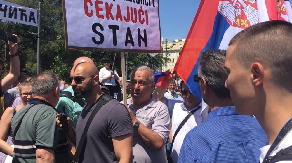 Prethodno je ista grupa krupnih momaka napala predstavnike demonstrantske grupe „Sedam zahteva“ i pocepala im transparent.
