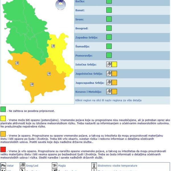 U jugoistočnoj i jugozapadnoj Srbiji, kao i na prostoru KiM upaljen je narandžasti meteo alarm zbog snega, dok je žuto upozorenje na snazi u istočnoj Srbiji.