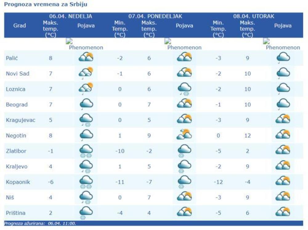 "Danas će u planinskim predelima padati sneg uz očekivanu visinu snežnog pokrivača do 10 cm, lokalno i više, a formiranje manjeg snežnog pokrivača očekuje se ponegde i u nižim predelima jugozapadne, južne i jugoistočne Srbije. U ponedelјak i utorak (7. i 8. aprila) u većem delu, a u sredu (9. aprila) još ponegde na jugu Srbije jutarnji mraz, intenziteta od -6 do 0 (na 2 m visine), dok se u višim planinskim predelima očekuje i ispod -10 stepeni", piše u najnovijem upozorenju RHMZ.