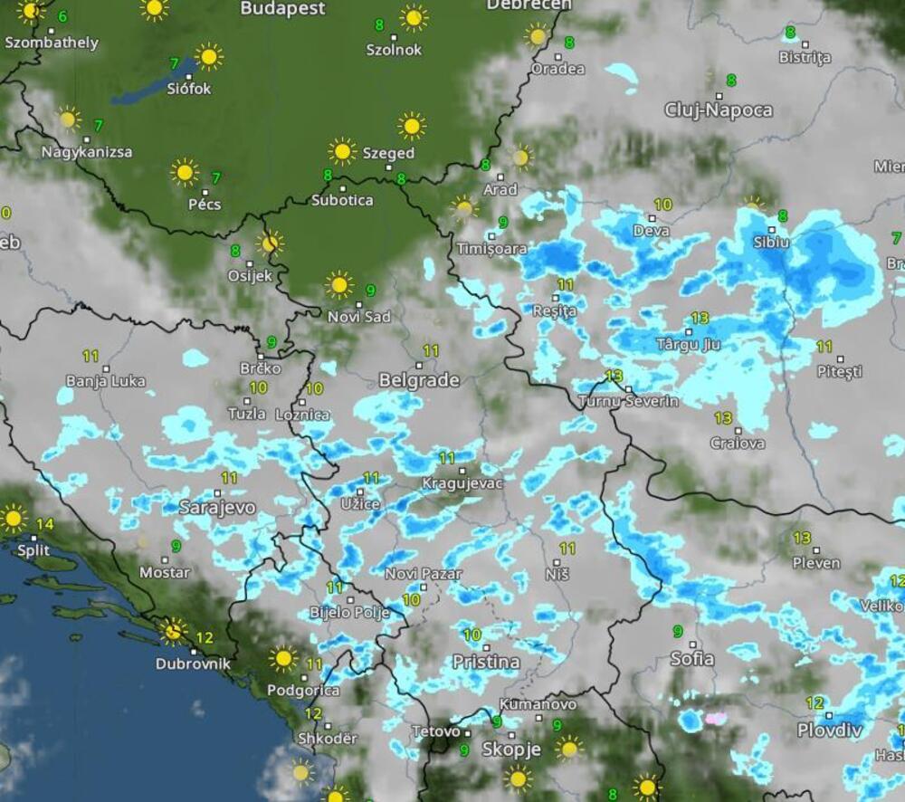 Kiše i pljuskova sa grmljavinom ima nad severoistočnim, istočnim, jugoistočnim i jugozapadnim predelima Srbije.