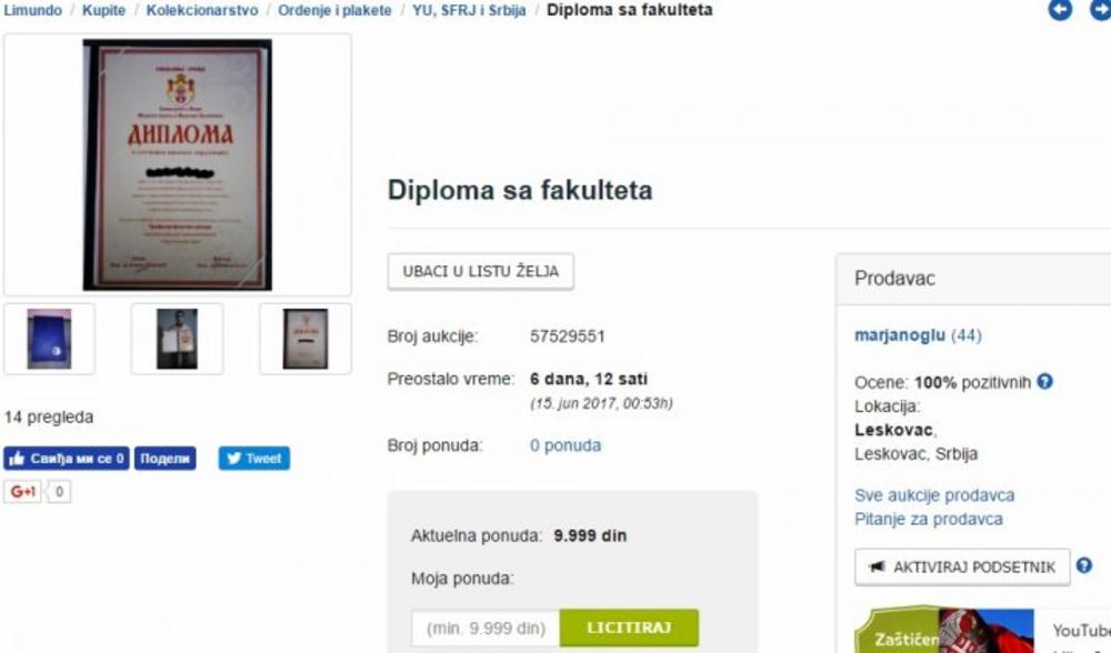 Hteli bi da postanete profesor, direktor javnog preduzeća, poslanik u skupštini, ministar ili čak predsednik države? Ambicije i planovi za tako nešto vam ne nedostaju, ali vam nedostaje diploma, navodi se u oglasu na sajtu Limundo gde možete izlicitirati za pravu diplomu sa niškog Fakulteta sporta i fizičkog obrazovanja, prenosi JuGmedia.