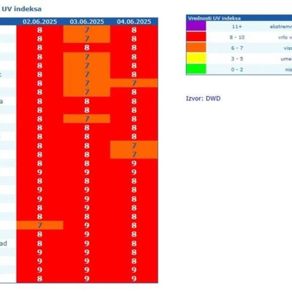 Danas (02.06.) sa maksimalnim temperaturama od 30 do 33 stepeni, a od sutra (03.06.) do kraja sedmice (08.06.) od 32 do 36 stepeni.