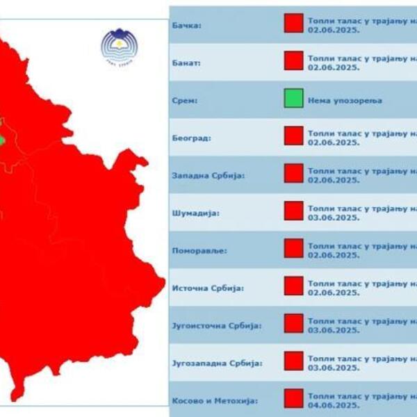 Republički hidrometeorološki zavod (RHMZ) objavio je da je od danas u Srbiji počeo prvi toplotni talas ove godine. Temperature su već danas visoke, a do kraja ove sedmice kretaće se i do čak 36 stepeni Celzijusovih! Kako se vidi na radaru sa sajta Vreme i radar, Srbija je potpuno obojena u jarko crvenu boju, što znači da su temperature veoma visoke, a Beograd je u rangu sa nekim od najtoplijih gradova na afričkom i azijskom kontinentu!