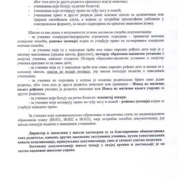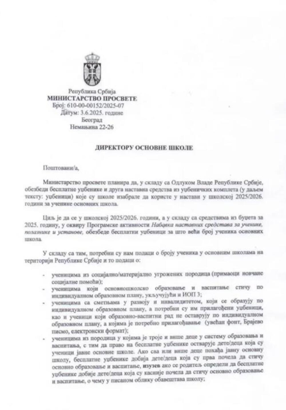 U nastavku se nalazi dopis koji je Ministarstvo prosvete prosledilo svim direktorima osnovnih škola u Srbiji, a povodom prikupljanja podataka o učenicima koji imaju pravo na besplatne udžbenike.