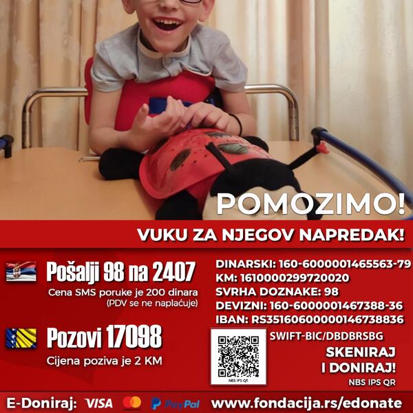 Vukova mama je samohrani roditelj i, zbog njegovog zdravstvenog stanja, nije u mogućnosti da se zaposli i obezbedi potrebna sredstva. Zato ovim putem upućujemo apel svim ljudima dobre volje da pomognu Vuku da napravi korake ka boljoj budućnosti. Svaka pomoć znači mnogo.