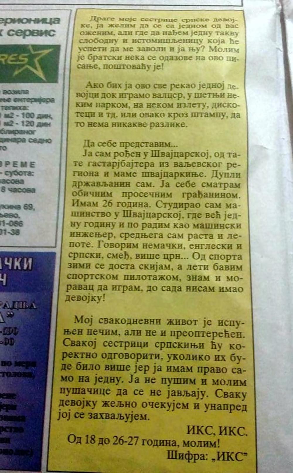 Iako je napisan pomalo "smotano", oglas je toliko iskren da će možda i biti zainteresovanih dama. Naime, gospodin Iks je rođen u Švajcarskoj, od oca gastrabajtera i majke Švajcarkinje. Dupli državljanin je, ali sebe smatra prosečnim građaninom. Radi kao mašinski inženjer, srednjeg je rasta i lepote!