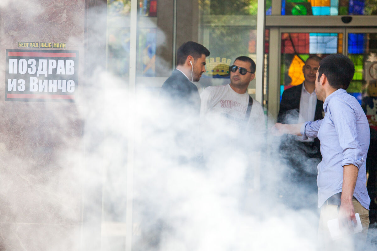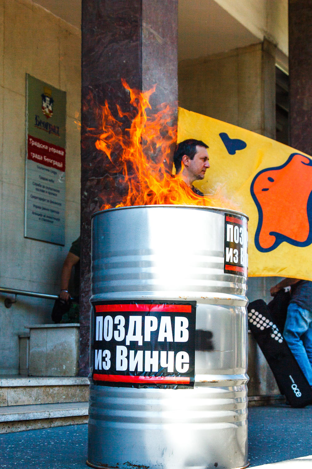 Grupa nezadovoljnih građana se sastala ispred uprave grada Beograda gde su i zapalili burad sa natpisom "Pozdrav iz Vinče" u znak protesta