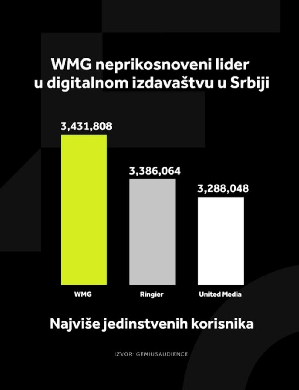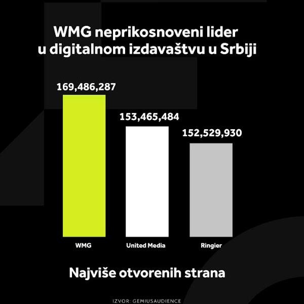 WMG je digitalna medijska kompanija broj 1 u Srbiji po broju jedinstvenih korisnika sa 3.4 miliona jedinstvenih korisnika, dok je 75,67% korisnika interneta u Srbiji provodilo čak 47 minuta mesečno na naših portalima.