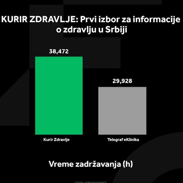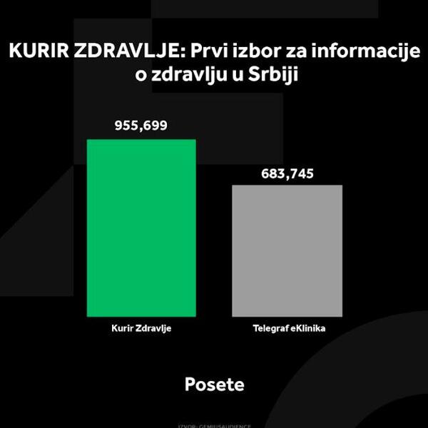 Podaci Gemiusa iz novembra pokazuju da je Kurir Zdravlje i dalje prvi izbor za sve koji traže najnovije informacije o zdravlju, ishrani, vežbanju i mentalnom zdravlju u Srbiji. Kurir Zdravlje beleži 40% više poseta u odnosu na konkurenciju, što potvrđuje njegovu superiornost i relevantnost. U novembru su korisnici ovog portala otvorili čak 600 hiljada stranice više nego korisnici Telegraf eKlinike, dok su se na portal Kurir Zdravlje u proseku zadržali 4 minuta i 33 sekunde. U poređenju sa Telegraf eKlinikom, Kurir Zdravlje na mesečnom nivou ima 90 hiljada korisnika više što potvrđuje da je ključna destinacija za sve koji žele kvalitetne savete i stručne članke o aktuelnim temama iz zdravstva. Sa sadržajem osmišljenim da zadovolji potrebe kako stručnjaka, tako i onih koji teže unapređenju svog zdravlja, ovaj portal je vaš pouzdani izvor informacija o svim aspektima očuvanja zdravlja.