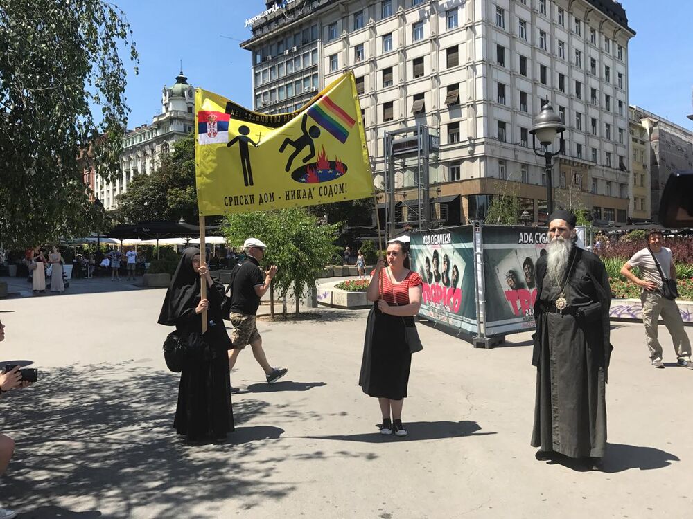 12:31 - Predstavnici Srpske Pravoslavne crkve su stigli kako bi se usprotivili Gej paradi. Nose transparent na kom piše "Ne sodomskoj revoluciji".