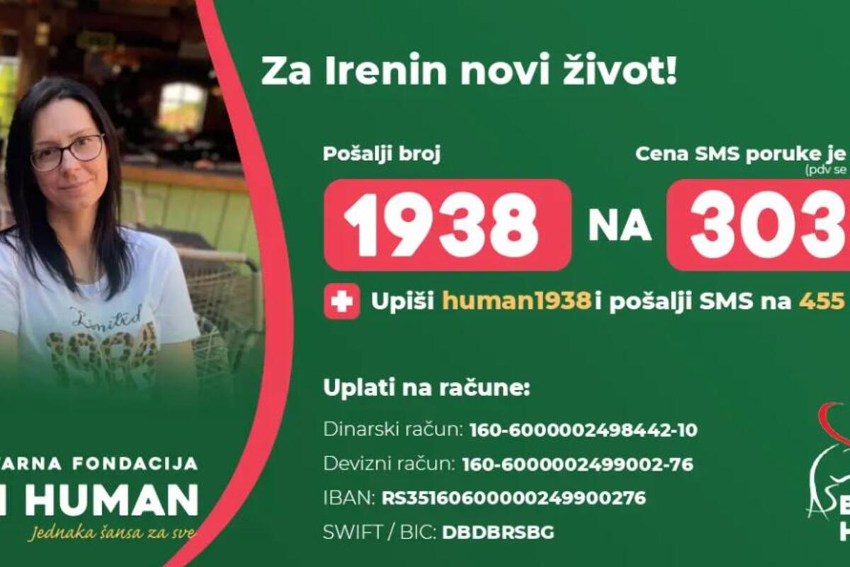 Za Irenin odlazak u Rusiju krajem maja nedostaje 52.000 evra. Oni koji žele da pomognu mogu poslati poruku na broj 1938 (SMS 3030) ili donirati na Trgu glumaca u Kruševcu, gde će 15. marta biti organizovan humanitarni bazar.