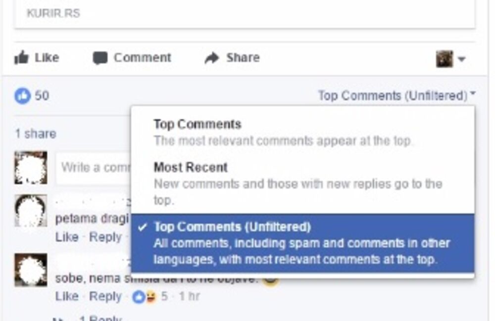 *NAPOMENA: Zbog transparentnosti akcije i jednake šanse za sve učesnike, u obzir će se uzimati SVI komentari koji budu postavljeni prema navedenim pravilima. Ovo uključuje i komentare koji se prikazuju i kada se otvore Fejsbuk filteri (Top unfiltered comments – slika ispod). Pobednici su autori 15 komentara s najvećim brojem dobijenih lajkova u gore navedenom periodu. Svi komentari koji budu postavljeni posle 13h biće diskvalifikovani.