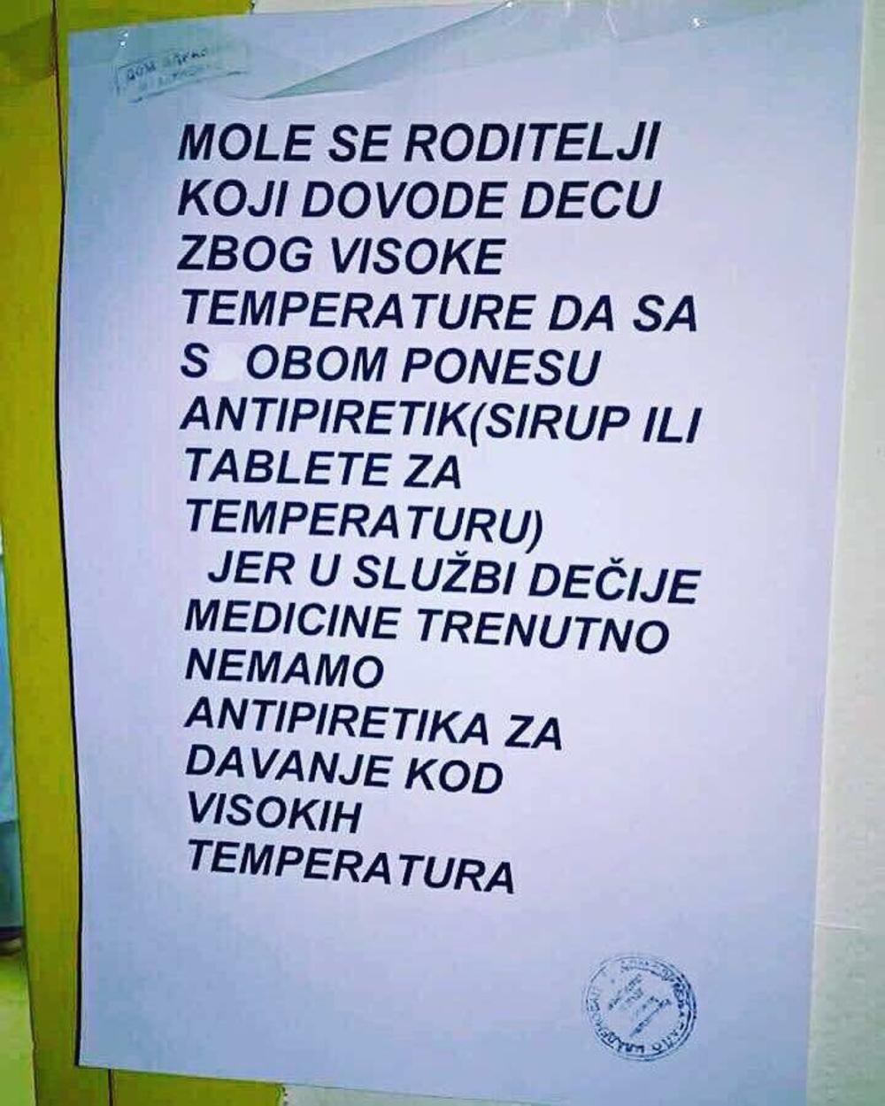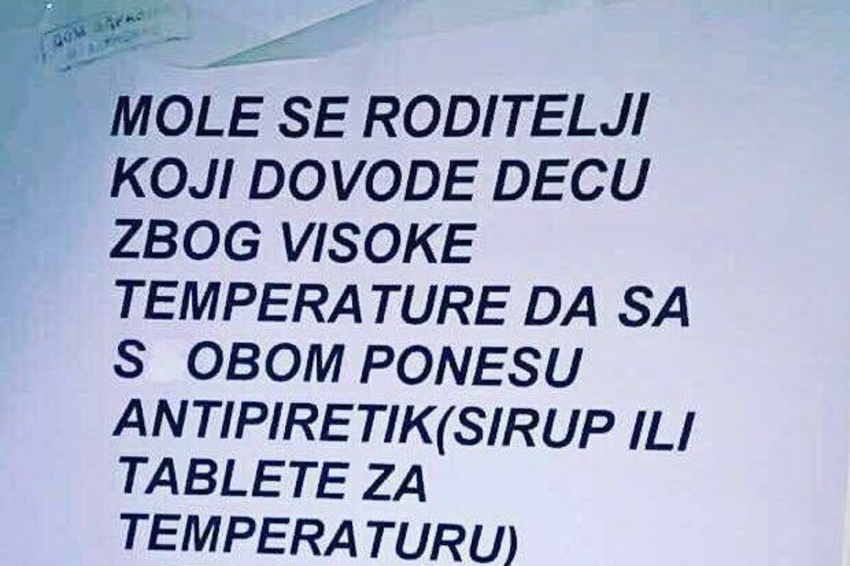 Naime, roditelji se mole da kada dovode decu zbog visoke tempereture, sa sobom ponesu sirup ili tablete za temperaturu, jer medicinska služba u kojoj se leče deca nema antiseptika za visoku temperaturu?!