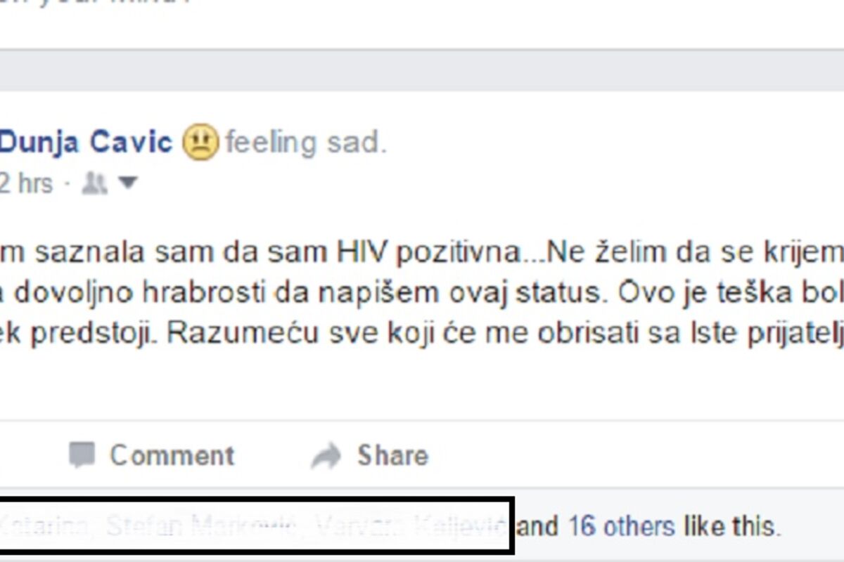 - Juče sam saznala sam da sam HIV pozitivna... Ne želim da se krijem, pa sam sakupila dovoljno hrabrosti da napišem ovaj status. Ovo je teška bolest i borba tek predstoji. Razumeću sve koji će me obrisati sa lste prijatelja i iz života...