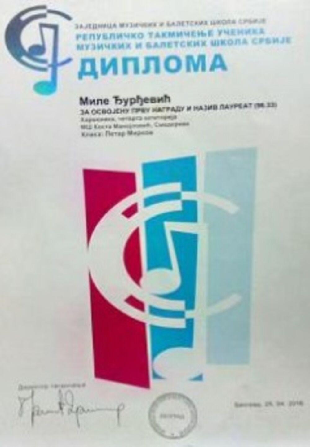 Zahvaljujući izvanrednim rezultatima stekao je pravo učešća na ,,Smotri muzičkih talenata Republike Srbije”, održane u Sremskim Karlovcima gde je proglašen za laureata kategorije srednjih škola.