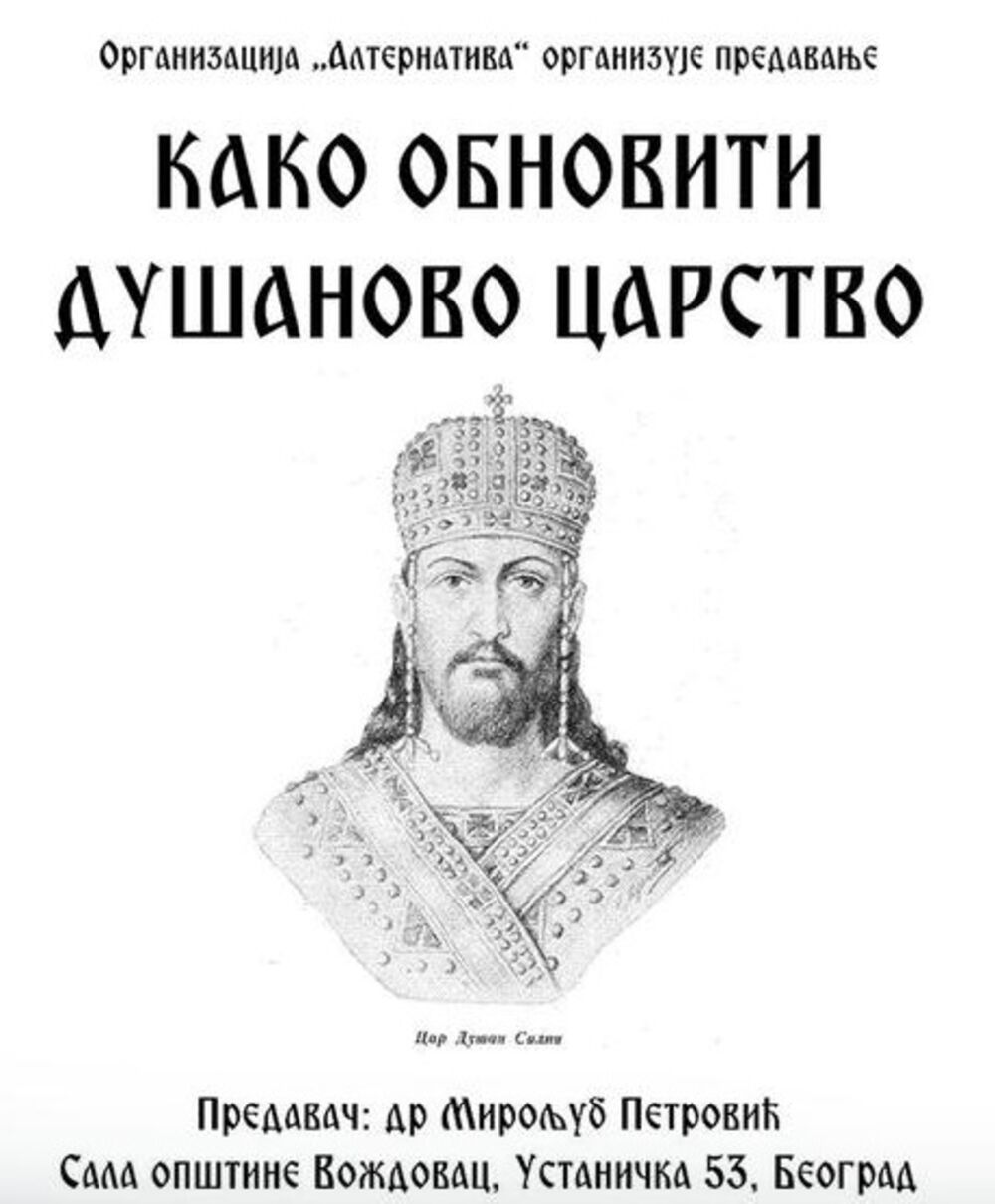 Iza ovih tribina stoji organizacija "Alternativa", a teme predavanja su između ostalog "Kako obnoviti Dušanovo carstvo". Organizacija "Alternativa" koja stoji iza ovog događaja, javnosti je poznata od ranije.