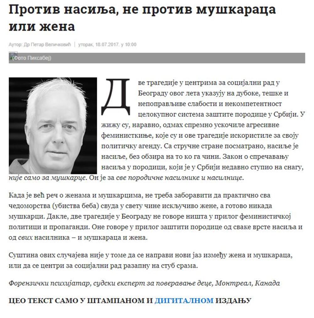 Oni su u današnjem štampanom, ali i digitalnom izdanju objavili tekst navodnog sudskog eksperta za poveravanje dece i forenzičkog psihijatra dr Petra Veličkovića iz Montreala, koji je "odbranio" stav dr Milivojevića da je Maja Đorđević sama kriva što je nju i njeno četvorogodišnje dete brutalno izmasakrirao poremećeni ubica Marko Nikolić, inače njen muž.