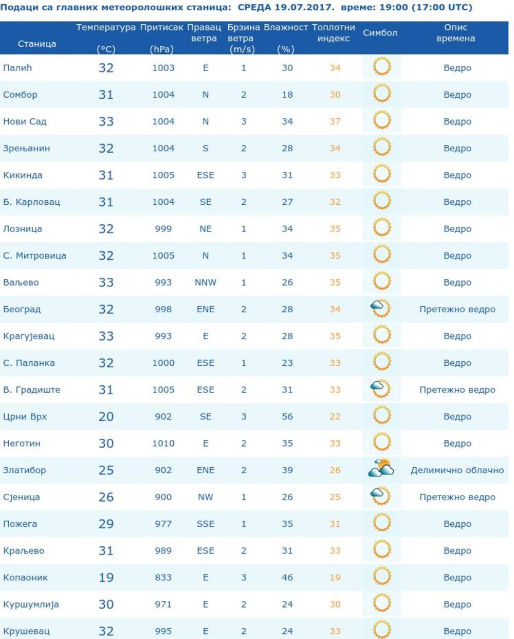 Vetar će biti slab do umeren, jugoistočni i istočni. Najniža temperatura od 12 do 22 C, najvisa od 32 do 35 C, saopštio je Republički hidrometeoroloski zavod.