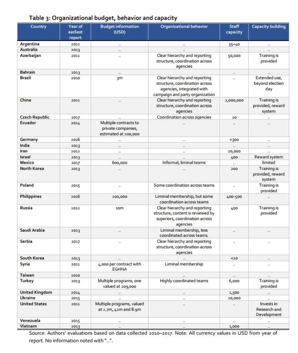 U trećoj tabeli nema informacija koliko su srpski botovi plaćeni (pisali smo o tome da - bar neki od njih - imaju plate i do 80.000 dinara mesečno), ali kao karateristika srpskih botova izdvaja se "jasna hijerarhija i struktura izveštavanja, razvijena koordinacija".