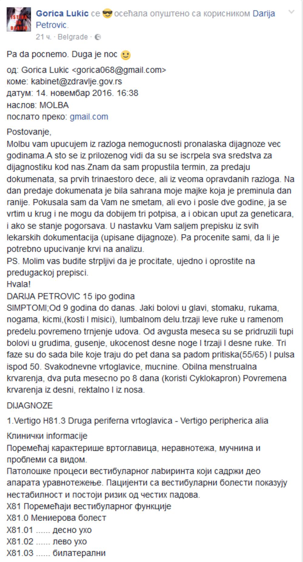 U javnosti je ime devojčice sa 55 dijagnoza ponovo pomenuto pre nekoliko dana. Tada je celu Srbiju podigla na noge. Darija se u otvorenom pismu obratila predsedniku, premijerki i ministrima s jednim pitanjem: "zašto mi ne date da živim?"