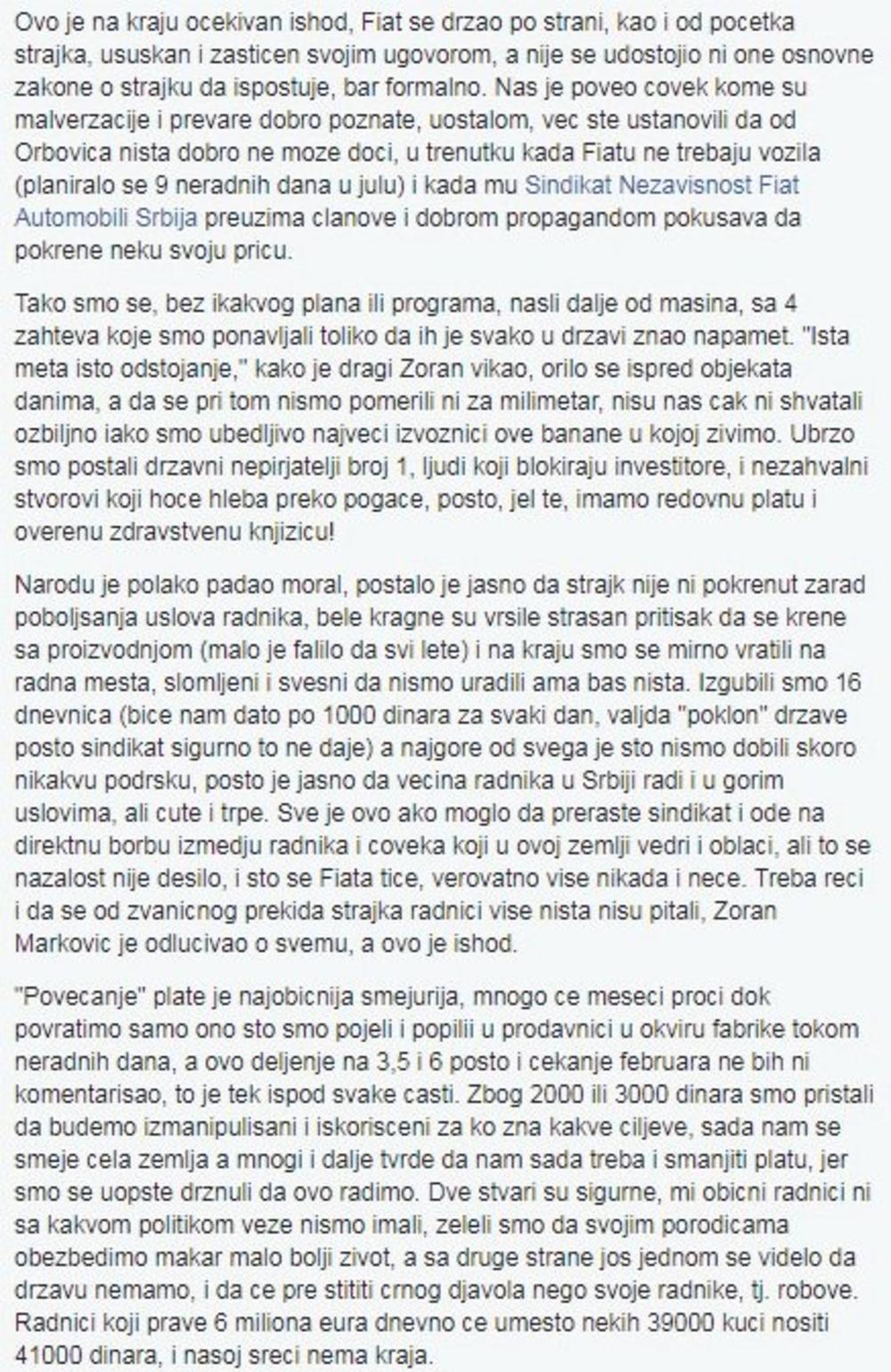 Nakon što su radnici "Fijata" prekinuli štrajk jer im je obećano povećanje plate od 3.000 dinara, mnogi su ostali razočarani u ishod štrajka i pristanak na mnogo manje od očekivanog. Tim povodom, jedan izrevoltiran radnik je napisao pismo koje se širi društvenim mrežama.