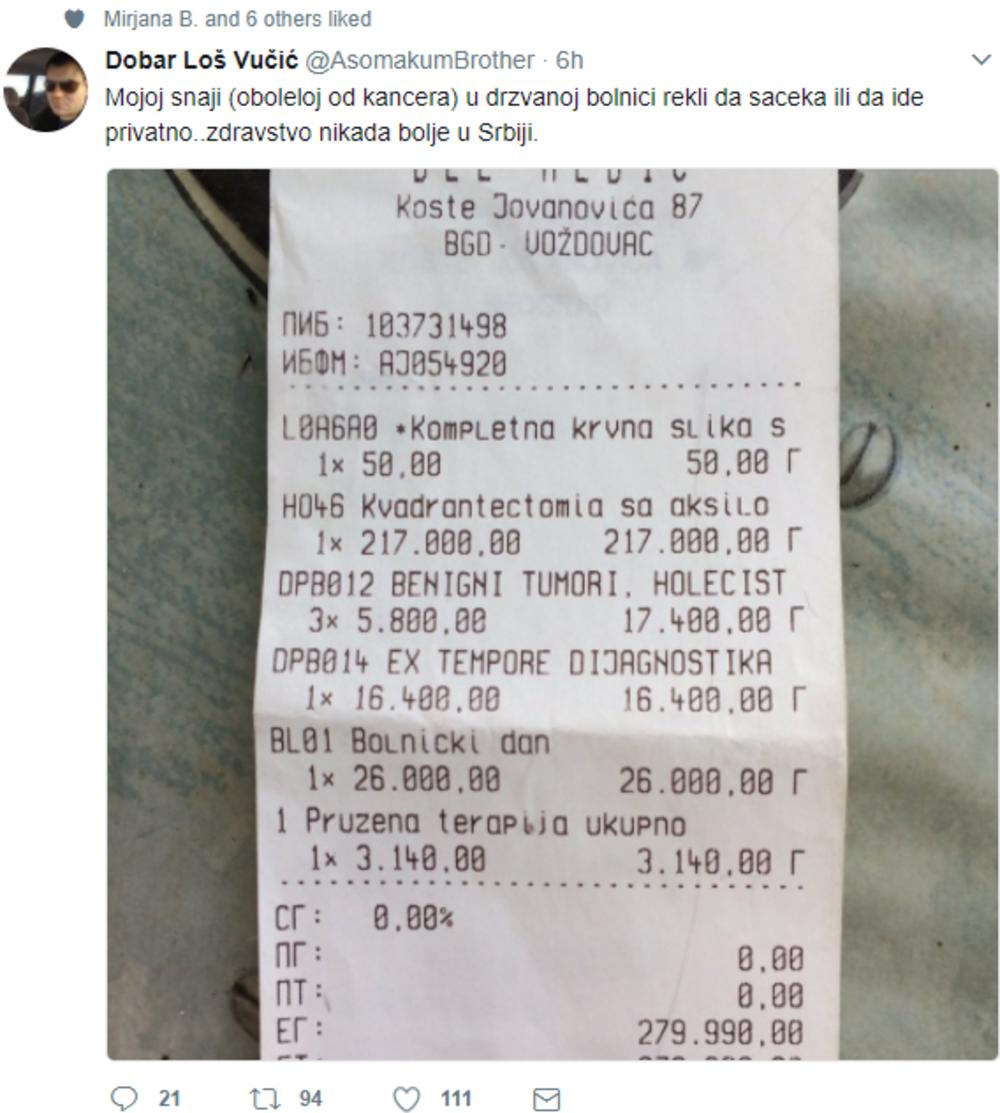 - Mojoj snaji (oboleloj od kancera) u državnoj bolnici rekli da sačeka ili da ide privatno. Zdravstvo nikad bolje u Srbiji, piše na jednom Tviter nalogu.