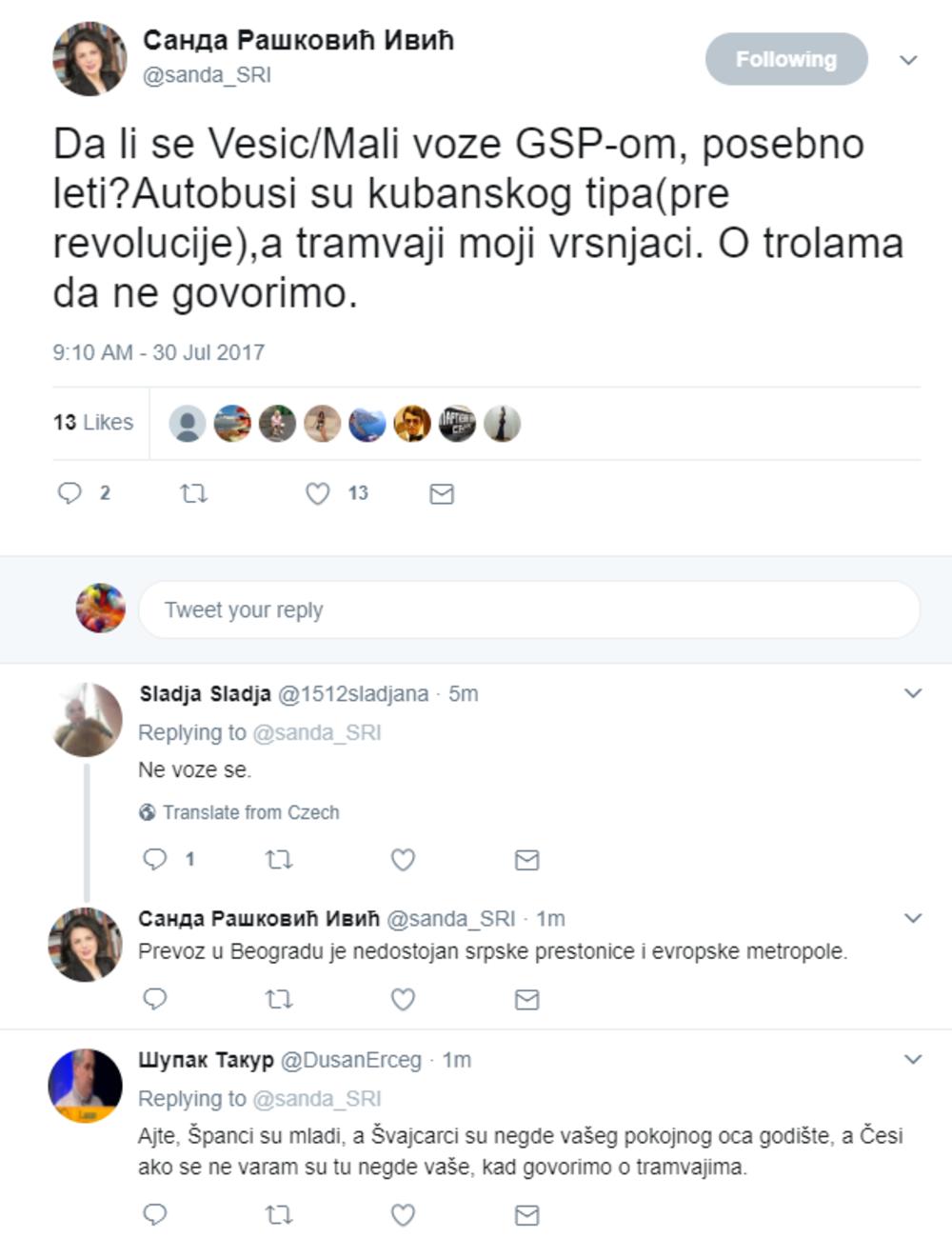 - Da li se Vesić / Mali voze GSP-om, posebno leti? Autobusi su kubanoskog tipa(pre revolucije), a tramvaji moji vršnjaci. O trolama da ne govorimo, napisala je Sanda na Tviteru.