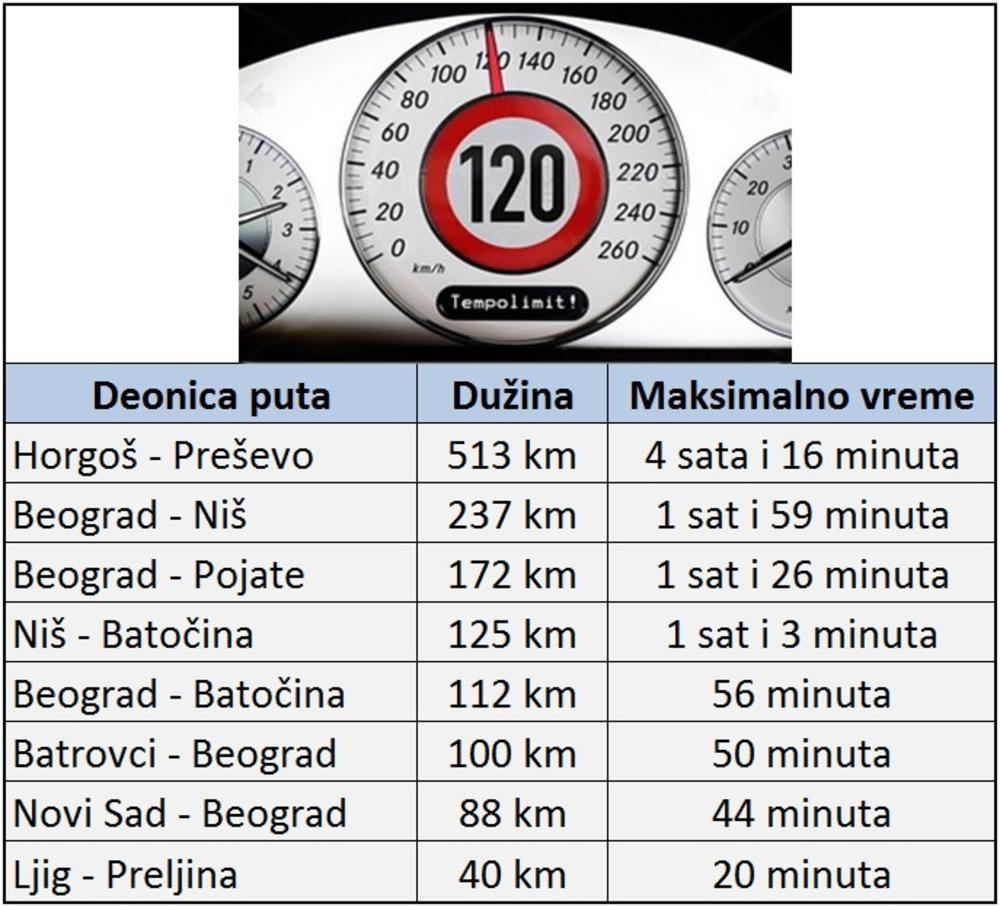 Ako želite da proverite koliko će vam vremena biti potrebno da maksimalnom dozvoljenom brzinom stignete sa jednog na drugi kraj najfrekventnijih deonica, pogledajte tabelu.