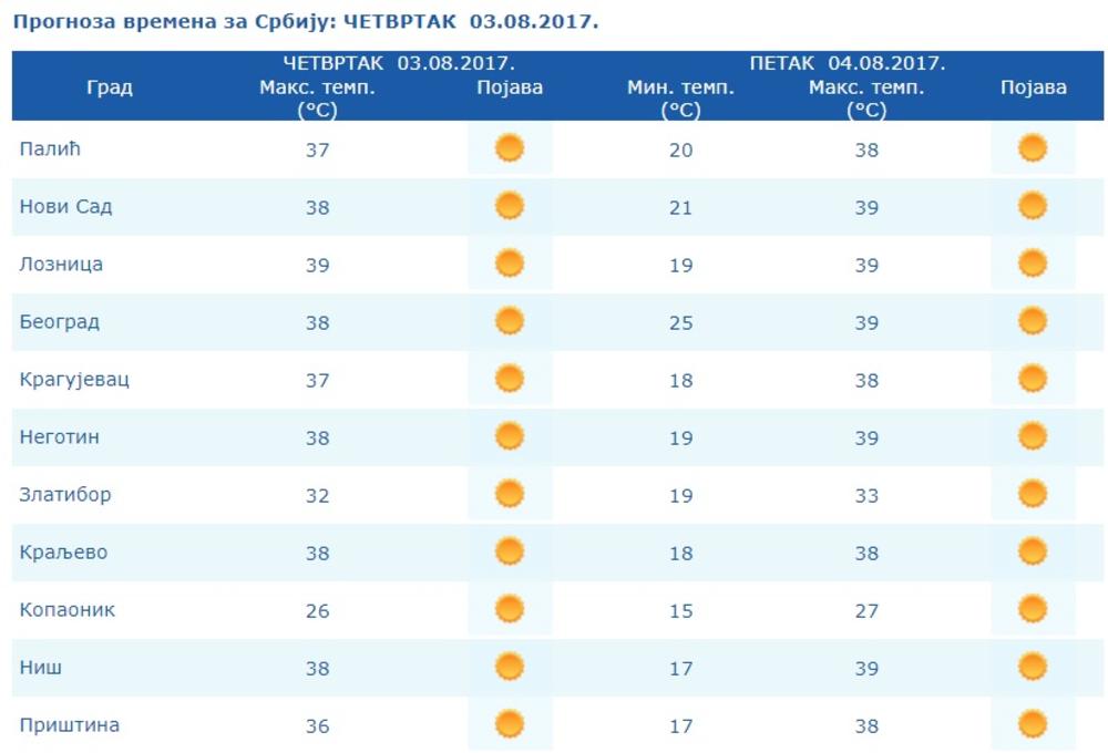 U Srbiji će danas biti sunčano i veoma toplo vreme, s temperaturom do 39 stepeni, saopštio je Republički hidrometeorološki zavod.Duvaće slab do umeren vetar. Najniža temperatura biće od 14 do 24 stepena, a najviša dnevna od 36 do 39 stepeni.