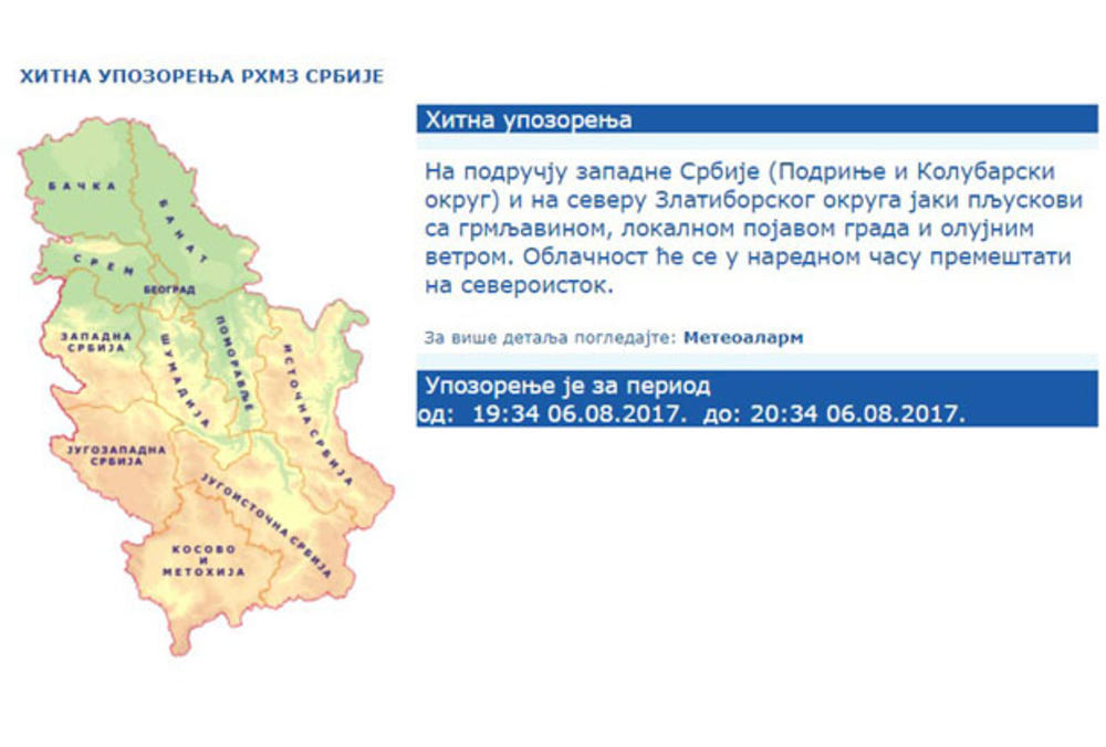 "Na području zapadne Srbije (Podrinje i Kolubarski okrug) i na severu Zlatiborskog okruga jaki pljuskovi sa grmljavinom, lokalnom pojavom grada i olujnim vetrom. Oblačnost će se u narednom času premeštati na severoistok", objavljeno je na sajtu RHMZ oko 19.30 časova.