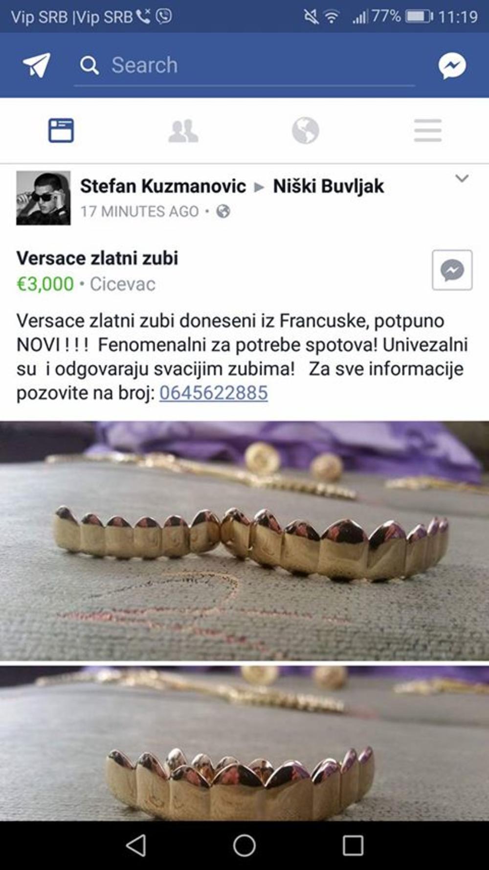Naime, on je postavio oglas na stranicu "Niški buvljak" gde prodaje Versaće zlatne zube koji su donešeni iz Francuske, a pritom su novi.