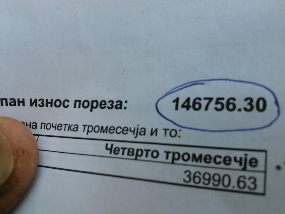 Miroslav Stamenković iz niškog sela Donje Međurovo nije mogao da poveruje svojim očima kada mu je stiglo poresko rešenje kojim mu je naloženo da za šest hektara njiva plati ni manje ni više nego 146.756,30 dinara. Da njegova neverica nije bila bez osnova svedoči to što je prošle godine za istu zemlju državi platio oko četiri hiljade dinara.