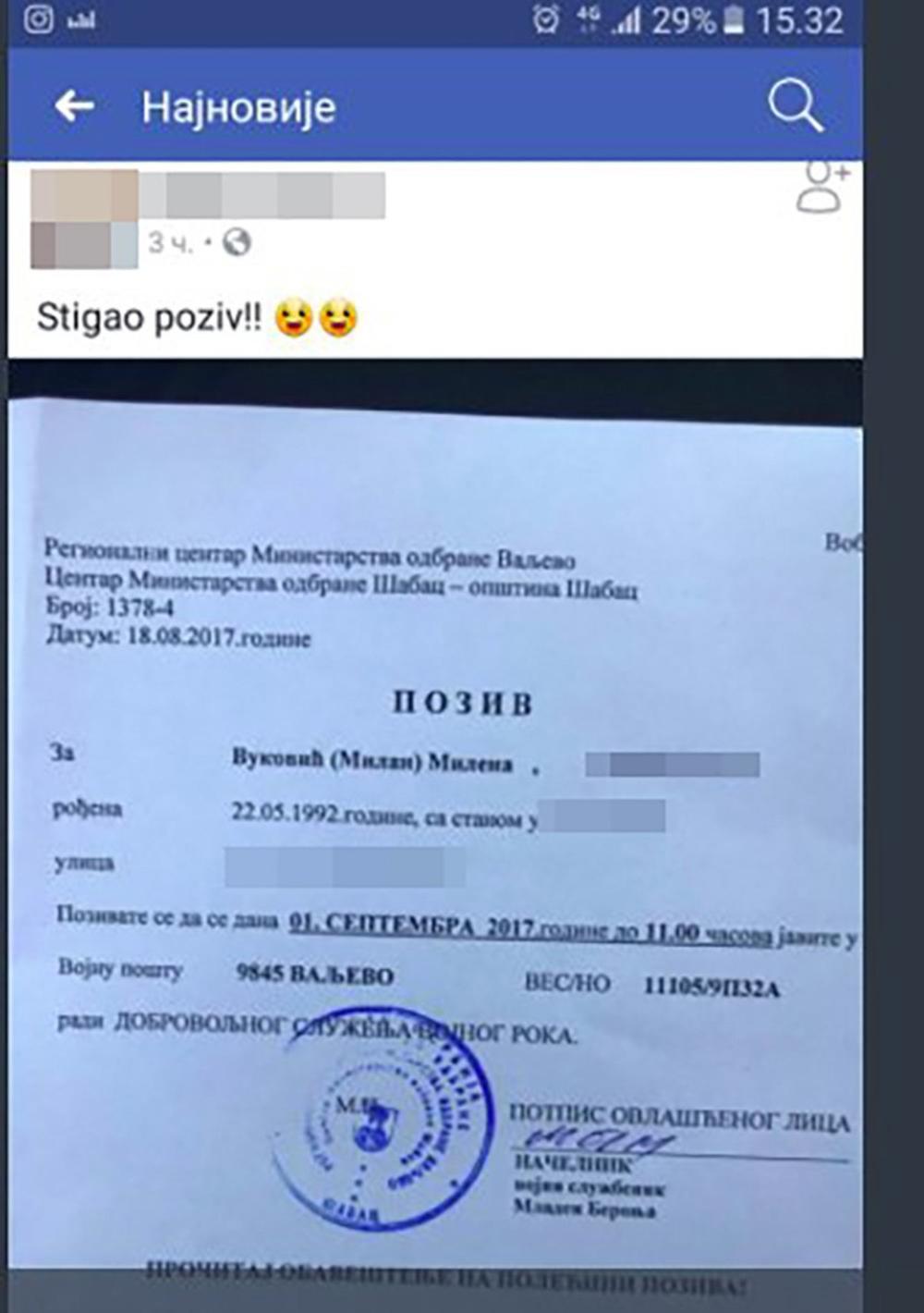 Milena Vuković (25) iz sela Slepčević u Šapcu, dobila je poziv za dobrovoljno služenje vojnog roka. Kako je naglašeno u pozivu, ona bi trebalo da se javi do 1. septembra u vojnu poštu u Valjevu.