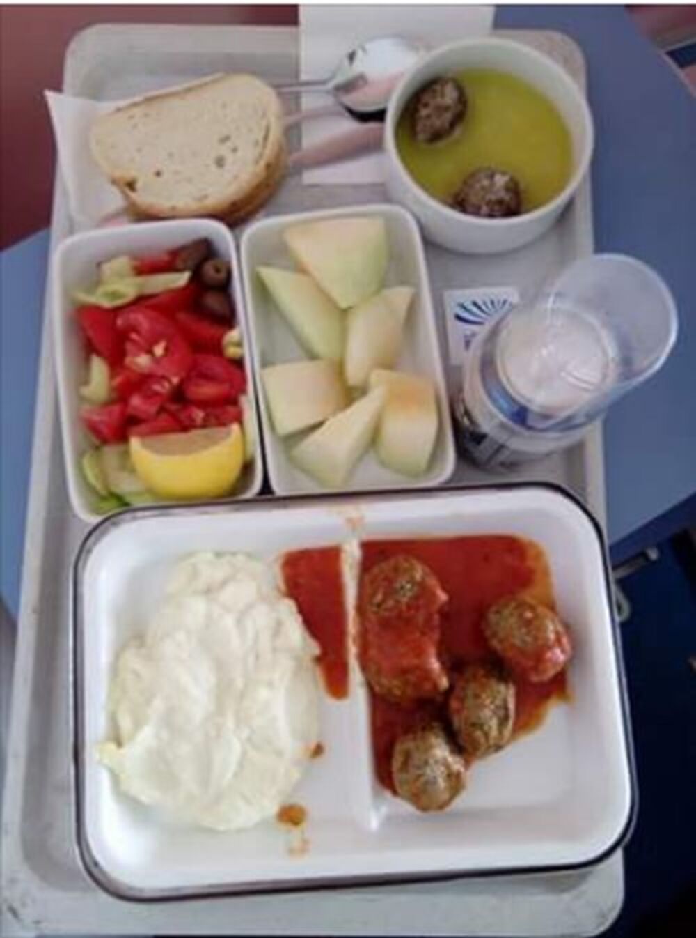 Tu su ćufte u sosu, pire, supa, sveža salata od krastavaca, paradajza, maslina i limuna. Zatim, tu je za desert dinja i neko osveženje.