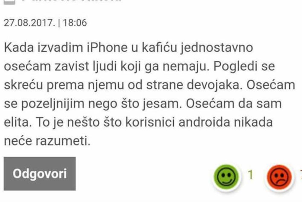 - Kada izvadim iPhone u kafiću jednostavno osećam zavist ljudi koji ga nemaju. Pogledi se skreću prema njemu od strane devojaka. Osećam se poželjnijim nego što jesam. Osećam da sam elita. To je nešto što korisnici androida nikada neće razumeti.