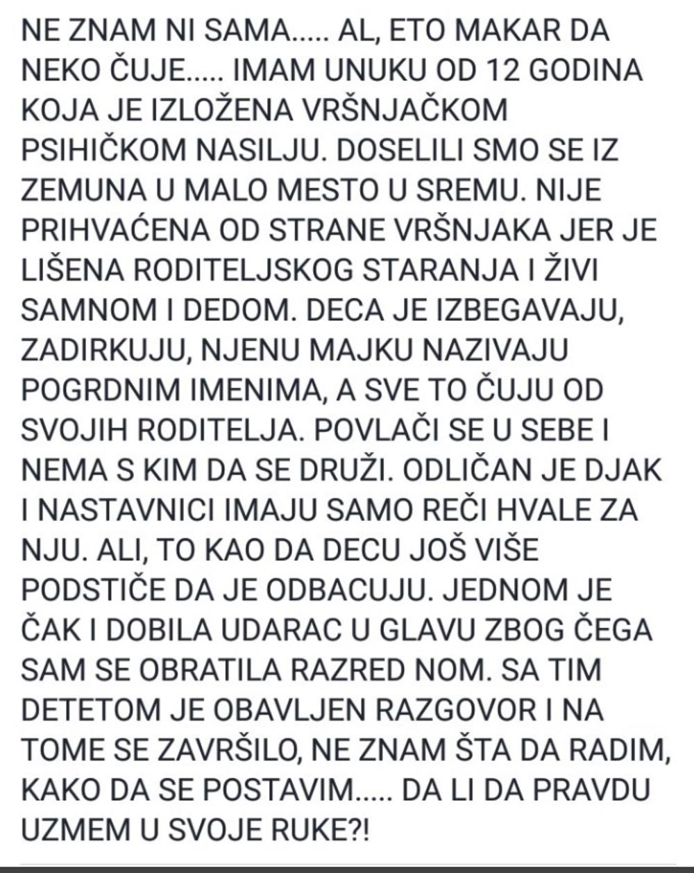 Ne znam ni sama. Ali, eto makara da neko čuje. Imam unuku od 12 godina koja je izložena vršnjačkom psihičkom nasilju. Doselili smo se iz Zemuna u malo mesto u Sremu. Nije prihvaćena od strane vršnjaka jer je lišena roditeljskog staranja. Živi sa mnom i dedeom. Deca je izbegavaju, zadirkuju, njenu majku nazivaju pogrdnim imenima, a sve to čuju od svojih roditelja. Povlači se u sebe i nema s kim da se druži... Odličan je đak i nastavnici imaju samo reči hvale za nju. Ali, to kao da decu još više podstiče da je odbacuju. Jednom je čak dobila i udarac u glavu, zbog čega se obratila razrednom. Sa tim detetom je obavljan razgovor, i na tome se završilo. Ne znam šta da radim, kako da se postavim? Da li da uzmem pravdu u svoje ruke?