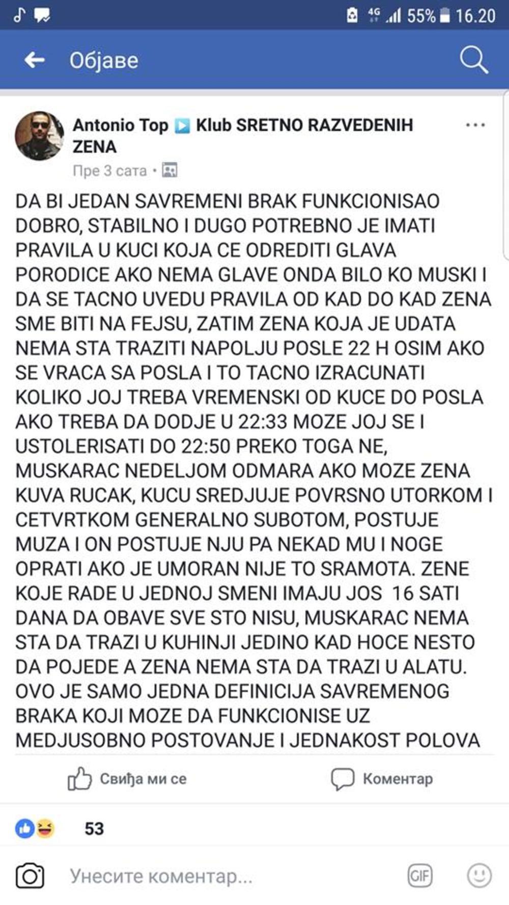 Korisnik društvenih mreža pod nazivom "Antonio Top" postavio je jedan veoma zanimljiv status u grupu pod nazivom "Klub sretno razvedenih žena".