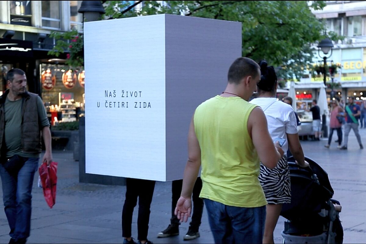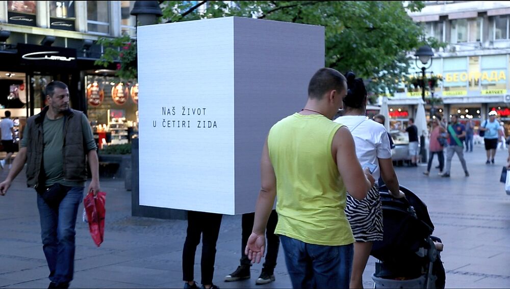 Pažnju Beograđana privukla šetajuća kutija, na kojoj je natpis „Naš život u četiri zida“.