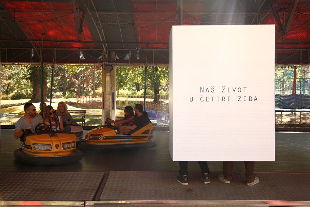 Bela kutija na kojoj piše „Naš život u četiri zida”, primećena je danas i juče na raznim lokacijama u centru prestonice – u Knez Mihailovoj ulici, zatim u Kalemegdanskom parku, kao i kod Doma zdravlja Stari Grad.