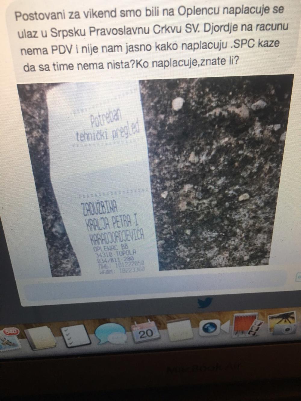 - Poštovani, za vikend smo bili na Oplencu. Naplaćuje se ulaz u SPC Sv. Đorđe. Na računu nema PDV i nije nam jasno kako naplaćuju. SPC kaže da sa tim nema ništa? Ko naplaćuje, znate li? - napisali su začuđeni turisti, koji su posetili za vikend Oplenac i ovu crkvu.
