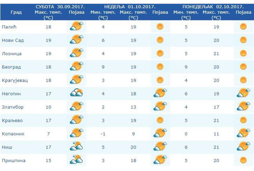 U Beogradu će biti sunčano, uz slab i umeren, jugoistočni vetar. Najniža temperatura će biti oko devet, a najviša dnevna 19 stepeni.
