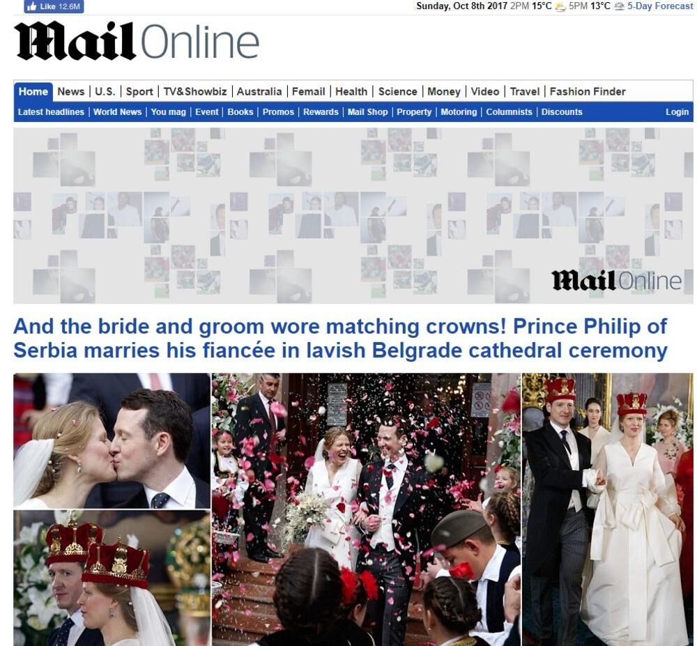 Tekst pod naslovom "Mlada i mladoženja su nosili identične krune! Srpski princ Filip se oženio na raskošnoj crkvenoj ceremoniji" donosi desetine slika i video snimaka sa kraljevskog veselja, praćene komplimentima za stajling mladenaca.