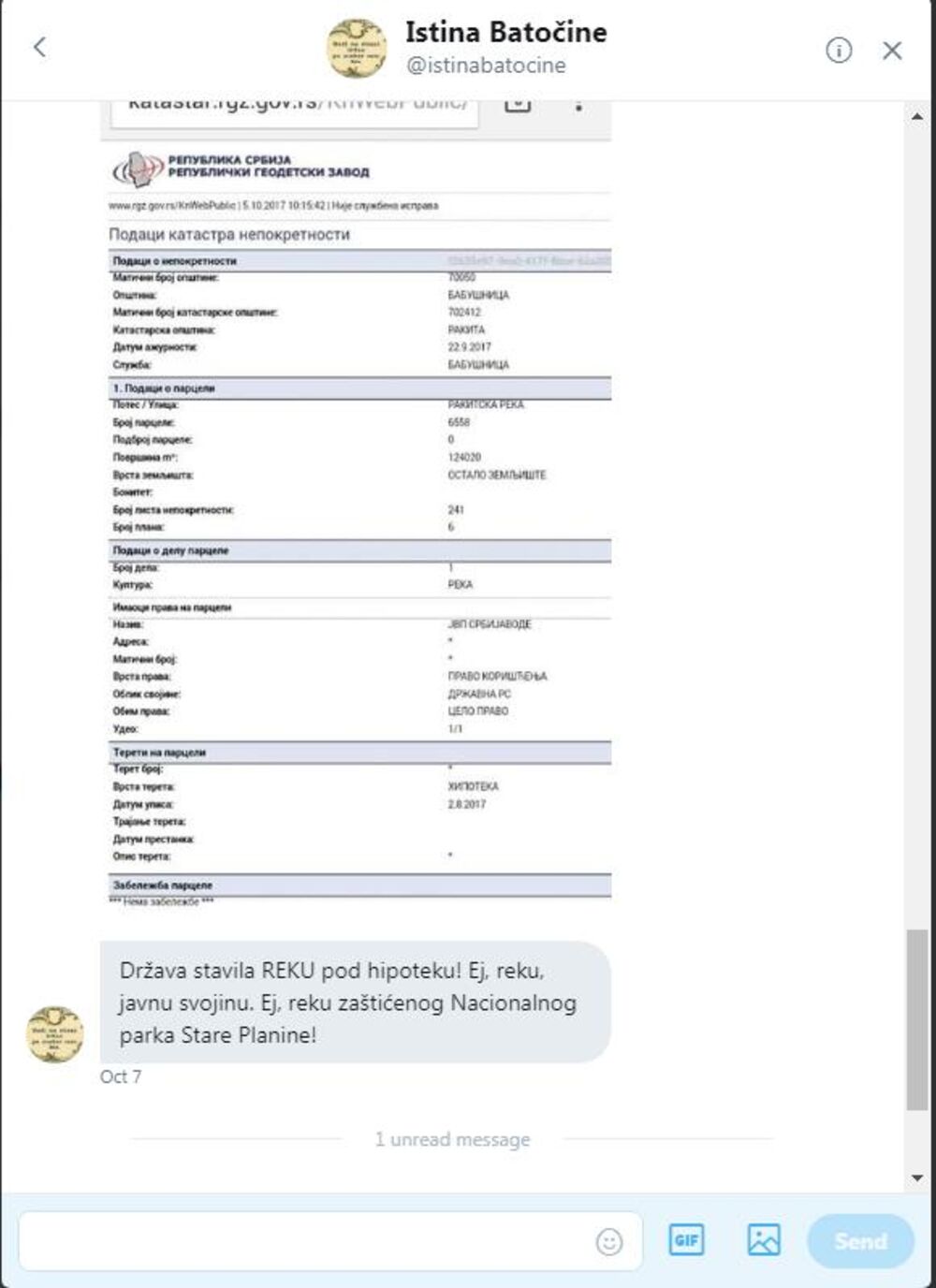 Naime, u dokumentu piše da je 02.08.2017 godine pod hipoteku stavila Rakitsku reku koja je deo zaštićenog Nacionalnog parka Stare Planine.
